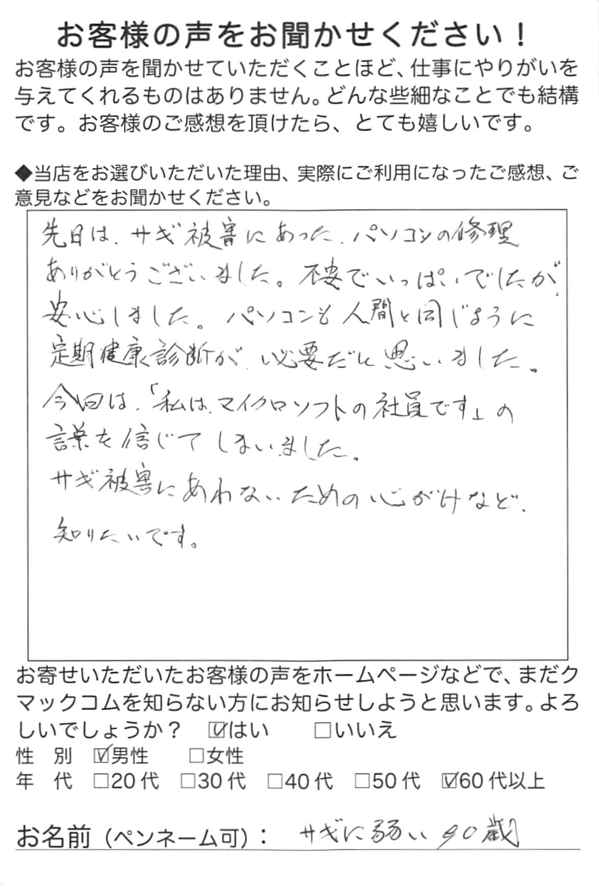 先日は、サギ被害にあった、パソコンの修理ありがとうございました。