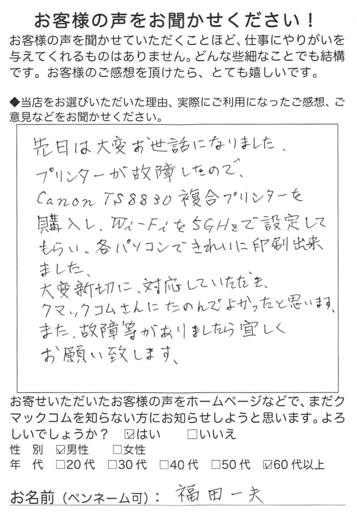 「先日は大変お世話になりました。プリンターが故障したので、Canon TS8830複合プリンターを購入し、Wi-Fiを5GHzで設定してもらい、各パソコンできれいに印刷できました。大変親切に対応していただき、クマックコムさんにたのんでよかったと思います。また、故障等がありましたら宜しくお願い致します。」