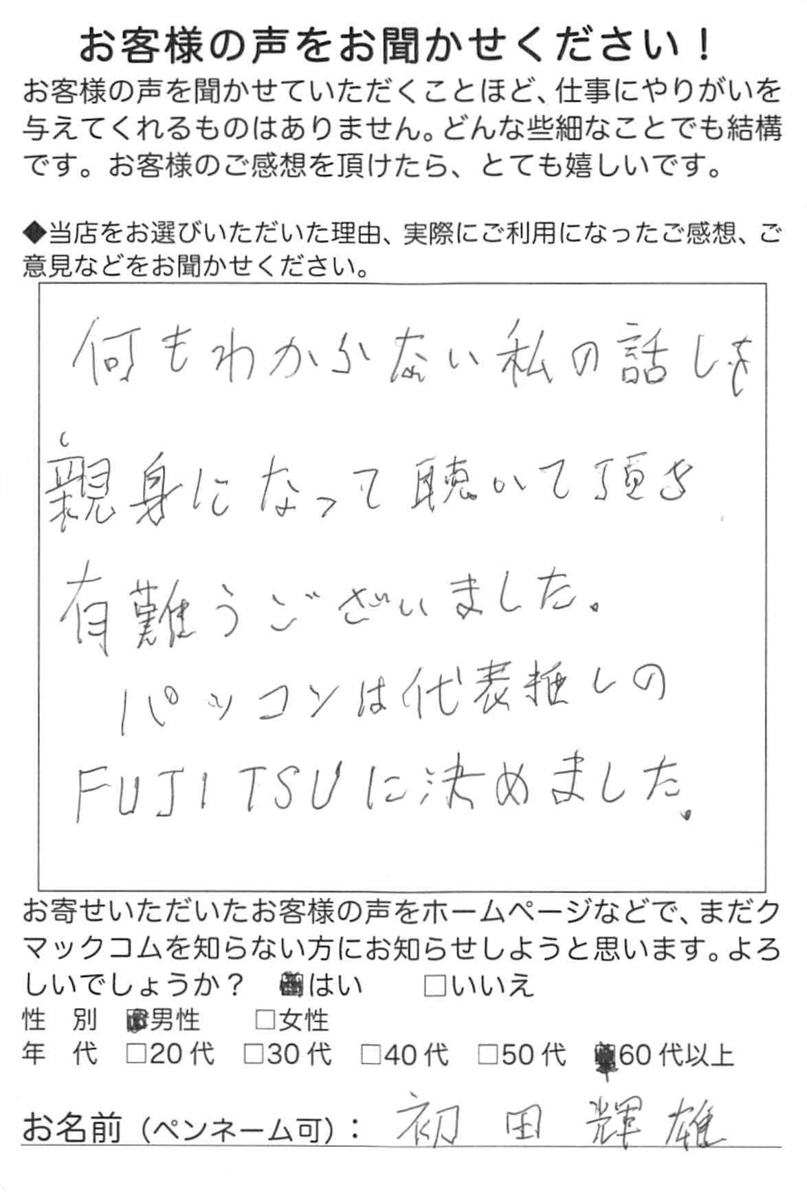 ペンネーム:初田様(男性・60代以上) 掲載許可:あり