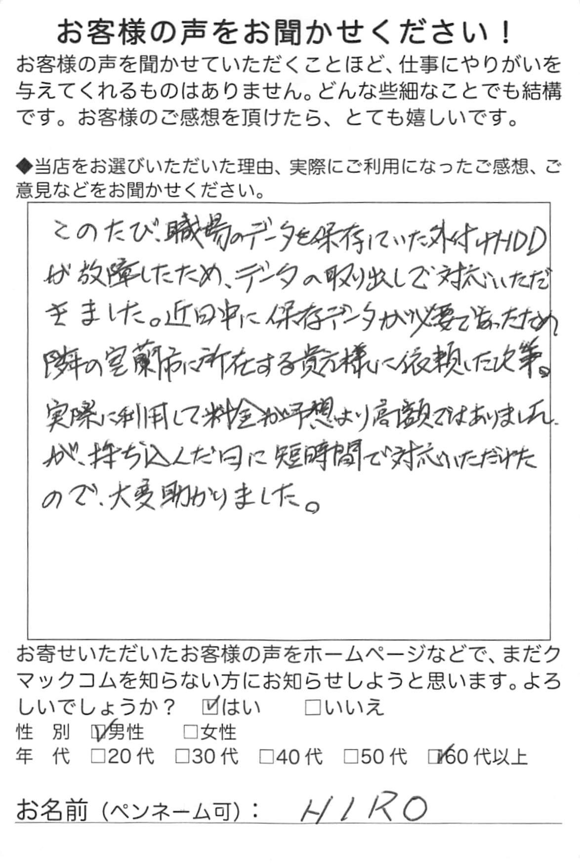 「職場のデータを保存していた外付けHDDが故障したため、データの取り出しで対応いただきました。近日中に必要なデータがあり、室蘭市のクマックコムさんに依頼しました。持ち込んだ日に短時間で対応いただき、大変助かりました。」