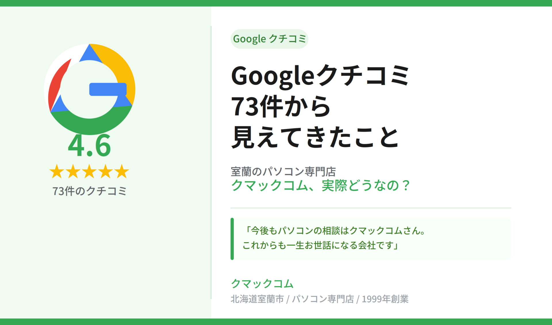 Googleクチコミ73件・評価4.6——お客様の声が積み上げてきた数字