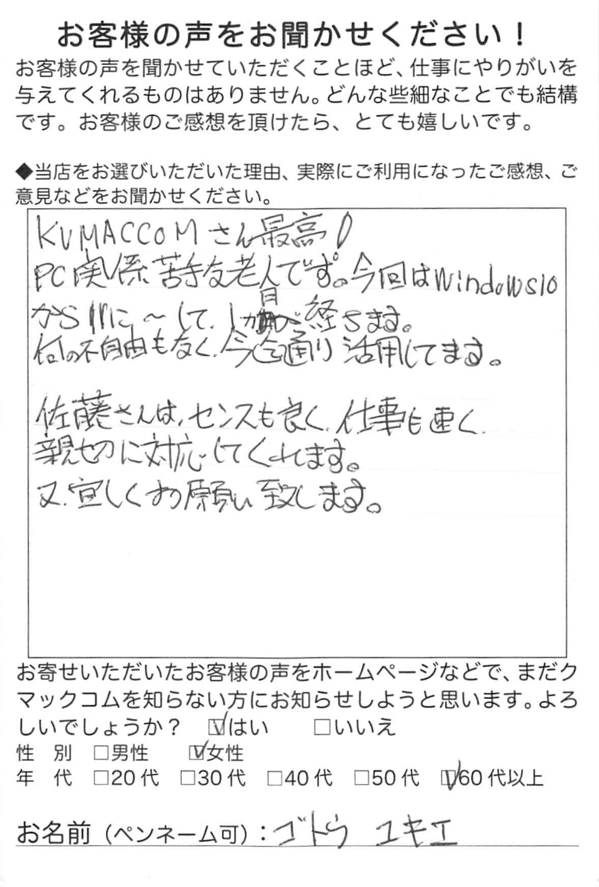 「KUMACCOMさん最高!」——この一言から始まるのは、室蘭市在住のゴトウ ユキエ様(60代・女性)からお寄せいただいたアンケートはがきです。ユキエ様は、「PC操作が苦手な老人です」とご自身を謙遜されつつも、今回、Windows10からWindows11へのアップグレードをご依頼くださいました。